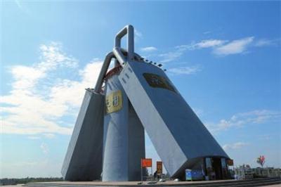 沿着灌区岸边的公路走近三盛公水利风景区,远远地就看到高大的三把大锁雕塑。这就是“黄河结”,也叫“同心锁”,高27米,重240吨,利用三盛公水利枢纽工程除险加固中拆除的退役闸门建造而成。三把大锁的名称分别是“永昌”“永固”“永恒”,三把大锁锁环相扣,象征着天地人和谐相处,祝福黄河生命永恒、枢纽工程安澜永固、祖国繁荣昌盛。