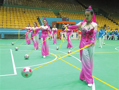 10日进行的健身球操、带球比赛精彩纷呈。健身球操赛场上,老人们精神抖擞,随着音乐舞动手中的健身球,时而跨步,时而转身,同时甩动健身球击打身体各穴位,动作流畅舒缓、姿势优美;带球比赛中,各老年参赛队动作连贯,时而正踢、时而侧踢,时而拨球、时而拍球,不断变换队形和动作,给人以美的享受。