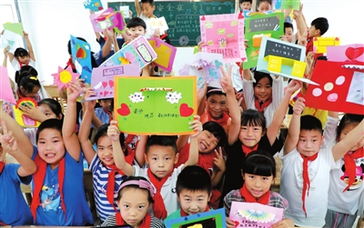 9月10日,江苏省连云港市东海县实验小学的学生在展示为老师亲手制作的教师节贺卡。