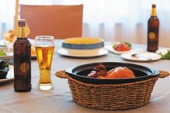 御膳一品鸡也是一道“功夫”菜。精选约2斤2两的广东黄油鸡,加入10种调味料腌制8小时。将鸡用开水吊皮,把用五花肉炒好的香菇、竹笋塞入鸡肚中,再将鸡放到砂锅中,锅中加入桂圆、荔枝、鹌鹑蛋和秘制酱汁,连同砂锅一起烤制。3小时后,美味即成。此菜一上桌,揭开锅盖,香气扑鼻。整只鸡色泽红润,外焦里嫩,汁水丰盈,肉质嫩滑。而且水果的清甜,香菇、竹笋的清香,黄油鸡独有的肉香,多种味道在口齿间循环往复,让人回味无穷。