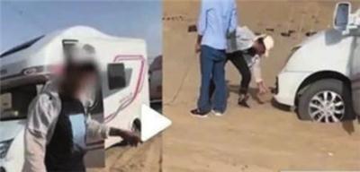 报道中还有一个细节。一位路过的旅行博主,看到一辆房车陷在路边的沙堆里,就停车准备帮助把车拖出来,却遭到当地一个身穿白衣的男子阻拦。真是司马昭之心,顷刻间就暴露了。