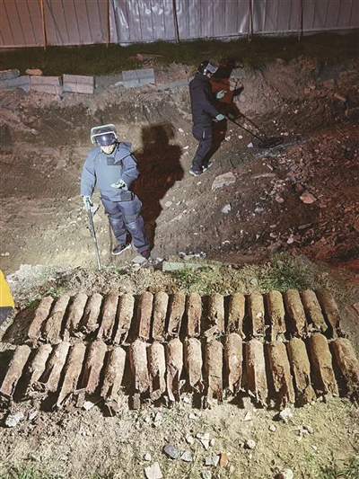 22日19时许,巡特警支队接110指挥中心指令称,云中路一处工地内发现多枚疑似炸弹,弹体完好。接到指令后,巡特警支队立即安排安检防爆大队8名专业警力赶赴现场。为确保现场绝对安全,安检防爆大队部署一组警力进行现场警戒,另一组身着排爆服,携带专业仪器小心谨慎地对现场进行勘验,现场共搜排出34枚未爆炮弹,弹体直径8厘米,长35厘米。经鉴定,全部为解放前遗留的美式小型航弹,引信完好,因年代久远,稳定性极差,具有较强的杀伤力。