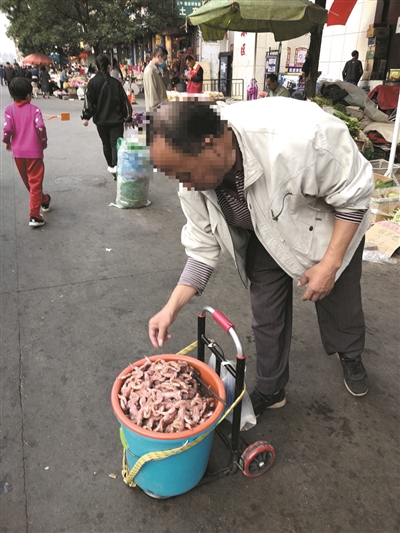 顾女士说,23日16时许,她在迎泽街便民市场看到,有商贩装了一大桶疑似青蛙肉在市场里兜售。为了确认是否是青蛙肉,她还询问对方究竟卖的是啥?对方称是从野外抓捕的青蛙,然后加工处理好出来卖。随后,顾女士悄悄给记者打了电话。
