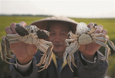 9月27日,在卢龙县卢龙镇雷店子村稻蟹种养基地,农民展示刚捕捞的螃蟹。