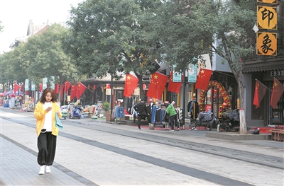 国庆临近,我市大街小巷随处可见迎风飘扬的五星红旗,处处呈现出喜庆祥和的节日气氛。图为华严广场附近商家门口都悬挂了国旗。 本报记者 于宏 摄