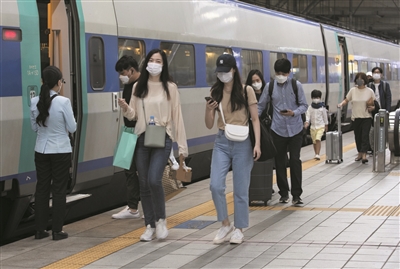 9月30日,在韩国首尔站,戴口罩的乘客们准备上车回家过节。