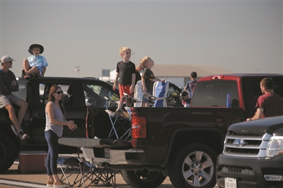 ◀ 10月10日,在美国休斯敦航空展上,观众在自己的车位观看飞行表演。