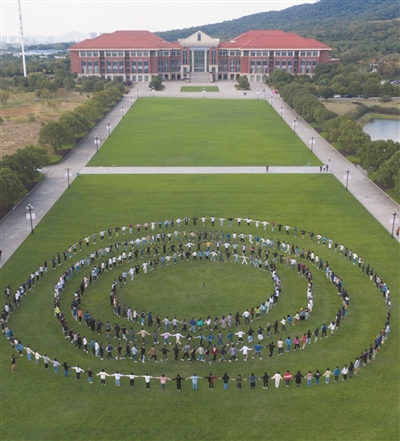 10月12日,南京传媒学院摄影学院约400名大一新生在老师的带领下展示《太阳的光圈》——人与自然行为艺术,在太阳下打开“光圈”,向地球、祖国、学校表达热爱之情,以此迎接崭新的大学生活。