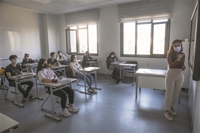当地时间10月12日,在土耳其伊斯坦布尔的一所学校,学生们戴着口罩在教室里上课。