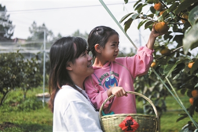 10月17日,游客在墅丰村的果园内采摘甜柿,感受丰收的喜悦。