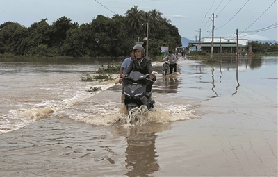 10月16日,越南宁顺省的居民在被洪水淹没的道路上前行。