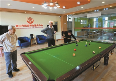 10月24日,老人在唐山市路北区逸翠园社区幸福家园养老服务中心打台球。