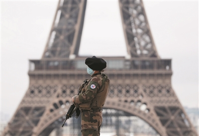 10月23日,一名军人在法国巴黎埃菲尔铁塔附近的特罗卡德罗广场巡逻。