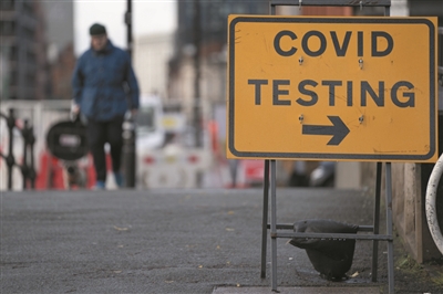 10月23日,行人从英国曼彻斯特一家新冠病毒检测中心旁走过。