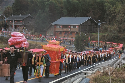 当日,湖南省邵阳市隆回县举行扶贫脱单集体婚礼,32对新人参加了婚礼,婚礼按照当地花瑶婚庆习俗礼仪举办。