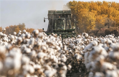 采棉机在新疆阿克苏地区沙雅县塔里木乡的棉田里采收棉花(10月23日摄)。
