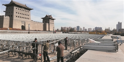 图为施工人员正在加紧搭建钢质龙骨 本报记者 戎禹仁 摄