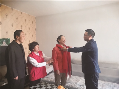活动中,街道和社区党支部的党员为社区的困难户送 去了米、油、面等慰问品,嘱咐老人们要保重身体,有困难随时找社区。当街道工作人员把大红色围巾戴在困难居民杜瑞花脖子上时,杜瑞花激动地说:“生活在这样的时代真幸福!生活在这样的社区真心宽!”
