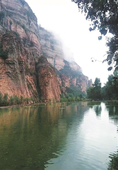 洗耳河位于黎城县西井镇,走在去洗耳河的路上,两边是壁立的丹崖,有的似伸出的手掌,有的似挺立的男根,有的似行走的骆驼,有的似平放的茶壶,有的似束髻的头颅,有的似呆望的少年……;还有的则抽象的,让你觉得什么都是,又什么都不是。几天的阴雨天气,湿气轻浮,一抹微云从半山腰飘出来,似要远去,又不忍离去的样子,盘桓之间,连映到山间的影子都诗意起来。渐走渐深,两边的山越来越近,树也多起来,草也茂起来。白杨树遮天憋日,核桃树枝繁叶茂;花椒树繁星点点,柿子树果挂枝头。披绿挂彩的绝壁之上,山体红白相间,红,红得耀眼;白,白得纯粹,很像是一块立着的巨大的五花肉。一路走来,牛乱村、谷堆坪、洗耳村等有着乡趣味十足名字的村庄掩映在绿树之间,古意盎然,黑瓦似在回味历史,青砖又像演绎现实,一声鸡鸣一声狗吠会在突然的宁静当中,让山间的岁月变得悠长。傍着右边的峭壁,阶托木门,亭阁相连,似有几缕热气从石桌上袅袅而起,又似有一股茶香萦绕不绝。偶尔一个女人的影子在亭子里闪现一下,然后又消失了;间或有一只猫蹲在石头墙上,看着什么,或者什么也不看,蹲着蹲着,就站起来,踱着步子,消失在墙角后面。女人和猫似乎是在一个漫长的故事里闪现了一下,然后就又走入故事的更深处去了。