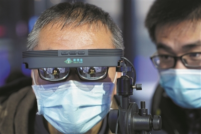 11月1日,一名参观者在科技创新新技术新产品展体验展出的增强现实(AR)眼镜。