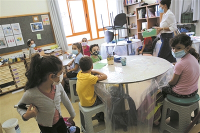 11月1日,在以色列中部城市莫迪因,小学生戴着口罩上学。