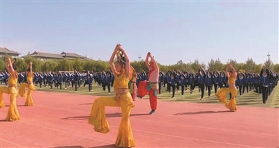 最近几日,敦煌中学的一段学生在课间操跳敦煌舞的视频走红网络,视频点击量达200多万次。在这段视频中,身穿校服的学生们随着音乐翩翩起舞,舞姿轻盈、优美,动作整齐,时而还摆出反弹琵琶、飞天等动作。