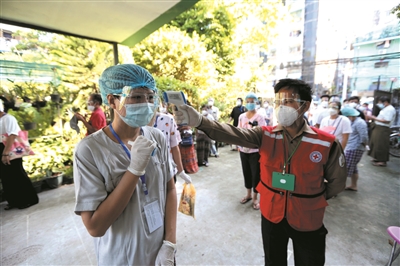 11月8日,选民在缅甸仰光一处投票站投票前接受体温检测。