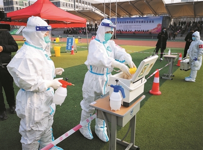 “请大家戴好口罩,保持一米的安全距离,有序进行检测……”16日9时30分许,全员新冠病毒核酸采样检测应急演练开始。记者在现场看到,市卫校的操场上拉起了隔离带,医务人员身着防护服、N95口罩、手套、护目镜、面罩……全副武装,严阵以待。为避免出现交叉感染,现场设置了3条核酸检测通道,每条通道均设置等候区、体温检测区、信息登记区、核酸采样区。“今天早上几点吃的饭?过了两个小时可以采集了。”“别紧张,抬头、张嘴,大声说‘啊’,”在采样区,医务人员为受检人员进行采样。医务人员将采集到的样本进行了封存、装车、转运;医疗废物也按要求进行封存、转运……整个过程分工明确、行动迅速,较圆满地完成了应急演练。