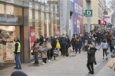 奥地利政府14日宣布,将从17日起升级全国“封锁”措施,以遏制新冠疫情。维也纳市民在措施升级前的周末扎堆来到商场购物,以避免措施升级可能造成的购物不便。
