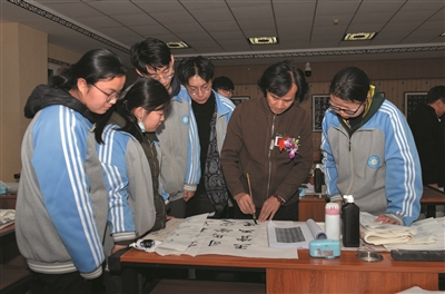 图为在大同三中,书法名家为师生现场示范、讲解魏碑书法。