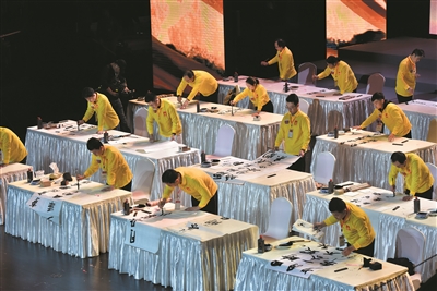 本报讯 (记者 崔莉英 见习记者 张彩峰) 21日,“云冈杯”首届全国魏碑书法双年展决赛在大同大剧院举行。天空雪花飘飘,大剧院内墨香四溢、书家云集,40位进入决赛的选手分组登台创作施展才艺。比赛分为上午场和下午场,上午场为40进15对决,下午场为15进5对决。电视书画频道、爱奇艺、今日头条等媒体通过网络直播的方式,让全国各地的书法爱好者在第一时间一饱眼福。