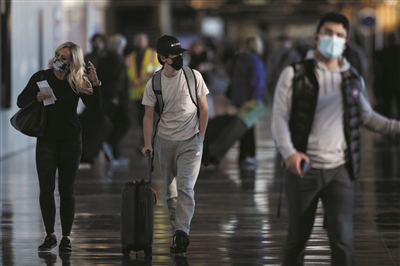 11月24日,戴口罩的旅客走在美国弗吉尼亚州阿灵顿的里根国家机场。