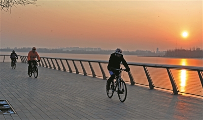 在文瀛湖畔,一队又一队骑行者身着统一的骑行服环湖追逐,尽情享受与自然亲近的乐趣。大同公园内,除了晨练的人群,有一支老年合唱团格外引人注目,他们几年如一日,每天定时开唱,吸引了来往人群驻足观看,成为大同公园的一道景观。除了这些地方,大同城墙带状公园也是市民休闲健身的好去处,打太极、练八段锦、跳舞、健步,一派火热。还有不少书法爱好者在这里练习地书。