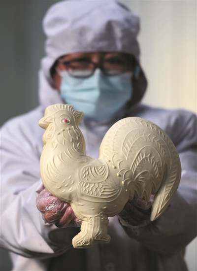 12月6日,黄骅市滕庄子镇一家面花制作工厂的工人在展示蒸熟的鸡形面花。