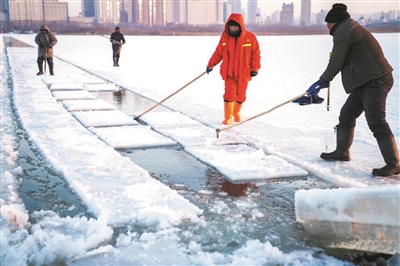 12月7日,工人在松花江哈尔滨段江面上采冰。