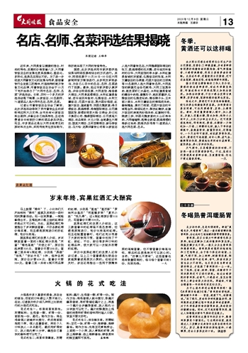 据悉,此次评选采用专家评委评选结果与网络投票相结合的方式进行。其中,网络投票于11月25日-30日在大同新闻网官方微信进行,众多网友积极参与,为自己心目中的名店、名师、名菜进行了投票。最终,经过专家评委认真评选,并结合网络投票,大同宾馆、梅香春大酒店、大同贵宾楼酒店、永和红旗美食城、老爷庙风味食府、弘雅饭店、永和文瀛饭店、花园大饭店、聚兴园砂锅居、红旗大饭店、皇城壹号、田园北魏家宴、得月楼饭店、凯鸽酒楼、浩海国际酒店、云冈建国宾馆、鼓楼东街老火锅·云锦会、孙记包子集团公司、魏都国际酒店、云冈美高大酒店、尚品御泉·木兰小馆、金地豪生大酒店、国宾大酒店、王府至尊酒店、新马泰饭店、马大哈·龙聚祥餐饮公司等26家饭店入选大同餐饮名店;大同魏都国际酒店的张文、凯鸽酒楼的汪天鹏、老爷庙风味食府的白华、大同宾馆的李永新、永和红旗美食城的宋斌斌、弘雅饭店的张高、永和文瀛饭店的马满意、花园大饭店的王明亮等30名厨师入选大同餐饮名师;大同宾馆的鲜黄花金汤花椒鸡、大同三宝蒸羊肉、地皮菜虾仁水晶包,永和红旗美食城的醒汤牛肉锅、酱熏肘子、地皮菜灌饼,弘雅饭店的弘雅老坛肉、清汤狮子头、玉米面小窝头,永和文瀛饭店的铜锅炖羊肉、酱焖嘎鱼、素炒刀削面,花园大饭店的平城落金凤、御福坛老大、酥皮红糖饼,红旗大饭店的麻地沟砂锅羊肉、红旗焖仔鸡、烧麦三拼,田园北魏家宴的火山石烤羊肉、大同碰碰糕、粗粮全家福,凯鸽酒楼的海参过油肉、凯鸽风沙鸡等71道菜品入选大同名菜、名点。