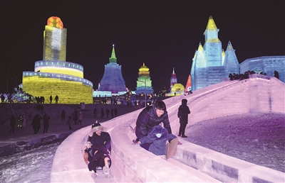 12月12日,游客在长春冰雪新天地主题冰雪乐园内体验冰滑梯。