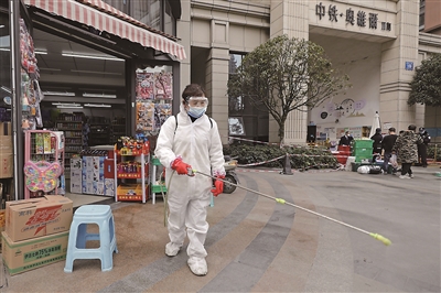 ◀12月11日,工作人员在四川成都市郫都区菠萝社区中铁奥维尔二期小区外消毒周边环境。近日,中铁奥维尔二期、三期小区被调整为中风险地区。