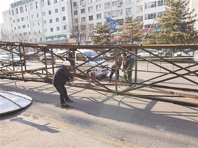 发现该处隐患后,街道迅速上报平城区政府,区政府先后3次派专业技术人员深入现场实地勘察。5日上午,由东街街道牵头,聘请专业资质公司,并联合交警、消防、综合执法、应急管理、卫体等部门共同行动,现场出动100余人,经过3个多小时的紧张作业,铁塔顺利拆卸至地面,及时进行切割并清运。
