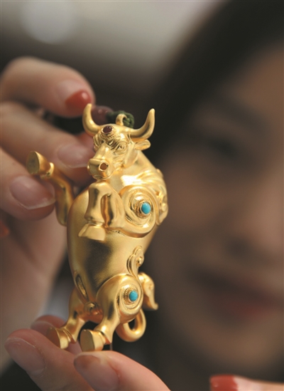 近日,牛年贺岁金条、摆件出现在济南市各家金店的柜台,受到消费者青睐。