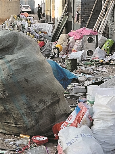 记者在该院1号楼东北侧看到,一家废品回收点占地面积较大,废塑料桶、废塑料筐、书本报纸、废铜烂铁分类放置,地上到处是废塑料纸、塑料泡沫等,周边环境特别脏乱。废品回收点居住的平房房门紧锁,烟囱在冒着烟。
