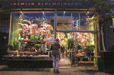12月14日,一名女子站在荷兰哈勒姆一家花店门口。