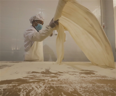 12月19日,工人在河北唐山丰润区七树庄镇七树庄村一家麻糖生产厂的车间工作。