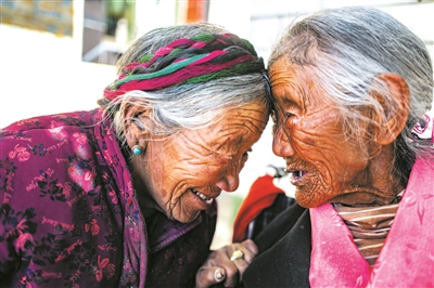 3月24日,在西藏山南市加查县热果村,109岁的索朗卓玛(右)和妹妹次仁行碰头礼。