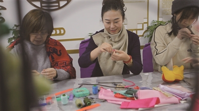 从小就深爱五彩斑斓布片的杨雪飞十分享受曾经的四世同堂时光,那时可以天天看到家里老人一针一线刺绣鞋垫,小学时便开始做布偶,还会与表姐妹分享手作成果。直到2010年,当时担任我市一家康复中心负责人的杨雪飞发现,在康复中心居住着的10余位年过七旬的老人会做盘扣,彼此还会用盘扣组成小物件互赠,老人们做出的饰品特别受欢迎。杨雪飞感觉自己找到了爱好同盟军,同时也意识到这么有老大同浓郁韵味的传统技艺濒临失传,于是向老人们了解手艺背后的故事,开始带着更多志同道合者动手做盘扣。就这样,大同飞天创意手工坊诞生了。