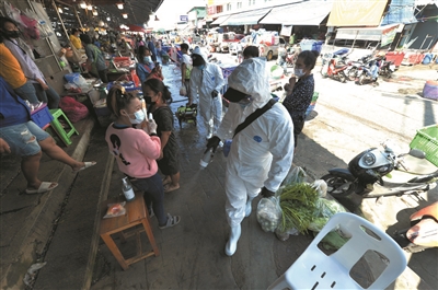 12月21日,防疫人员在泰国沙没沙空府一个市场进行消杀工作。