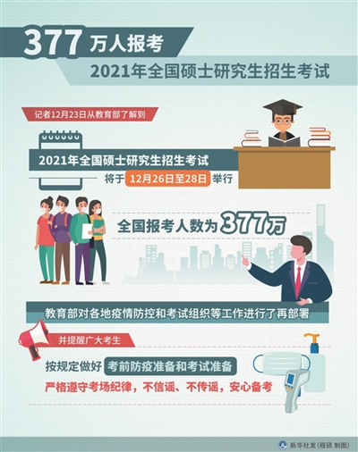 新华社北京12月23日电 记者23日从教育部了解到,2021年全国硕士研究生招生考试将于12月26日至28日举行,全国报考人数为377万。