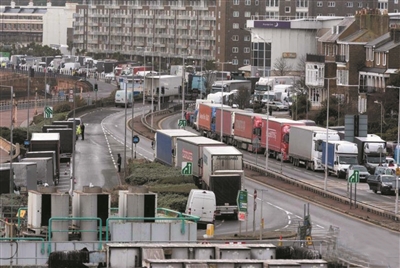 此前,为应对英国近期出现的变异新冠病毒,法国宣布从当地时间20日午夜起48小时内禁止来自英国的所有人员旅行,包括与公路、铁路、航空、水路有关的货运人员旅行。这给英国与欧盟国家之间的货物运输带来极大影响。自边境关闭以来,大约有2850辆卡车被困在英国肯特郡。