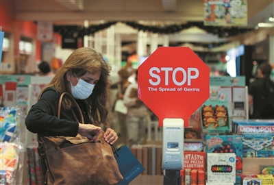 12月22日,顾客在澳大利亚悉尼一家商店的防疫提示牌前消毒。