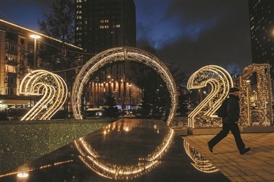 12月23日,在俄罗斯首都莫斯科,行人从“2021”造型的灯饰前走过。新年临近,俄罗斯首都莫斯科点亮各式彩灯,为城市营造节日的氛围。